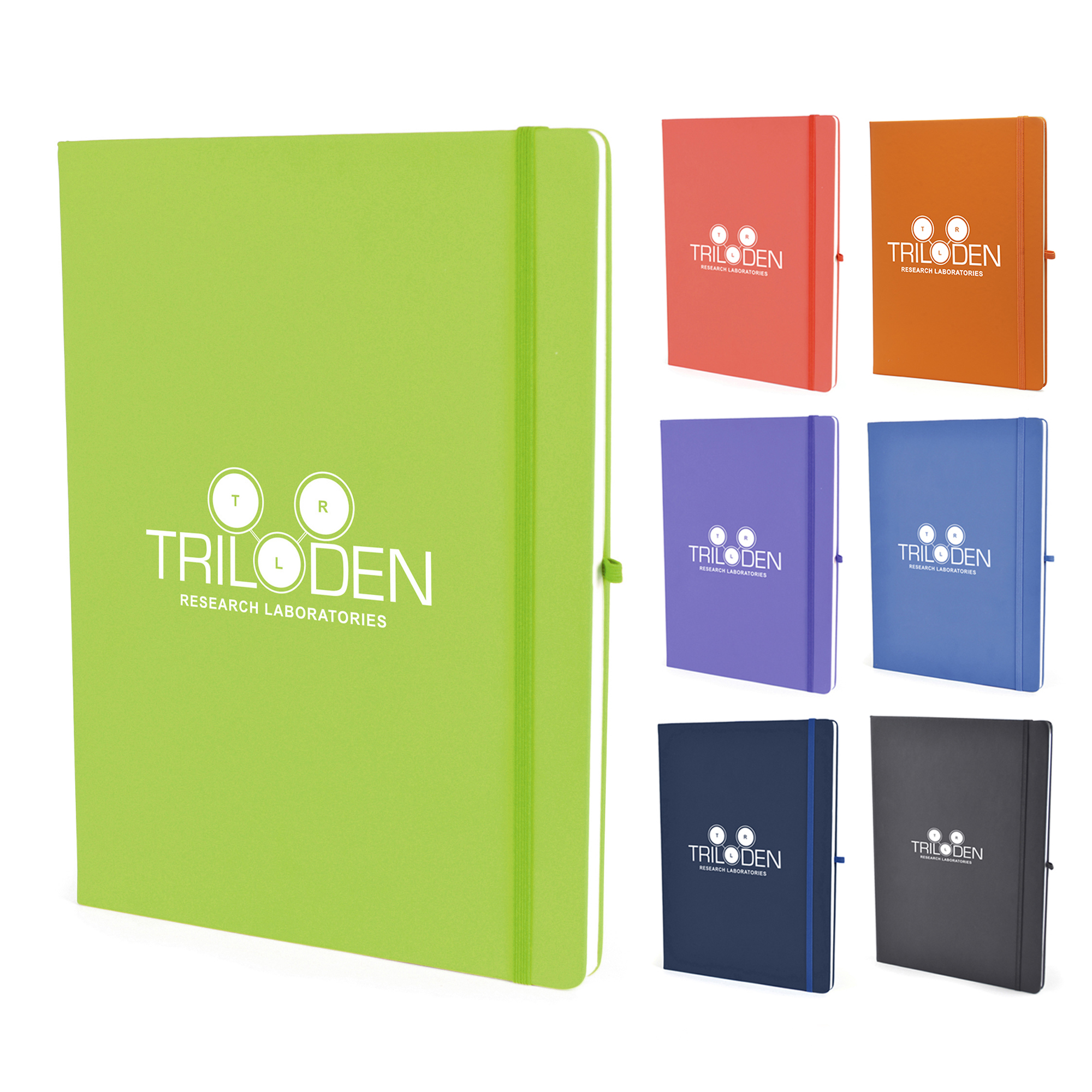 A4 PU soft finish 80 sheet lined notebook with ribbon bookmark, pen loop and elastic closure.