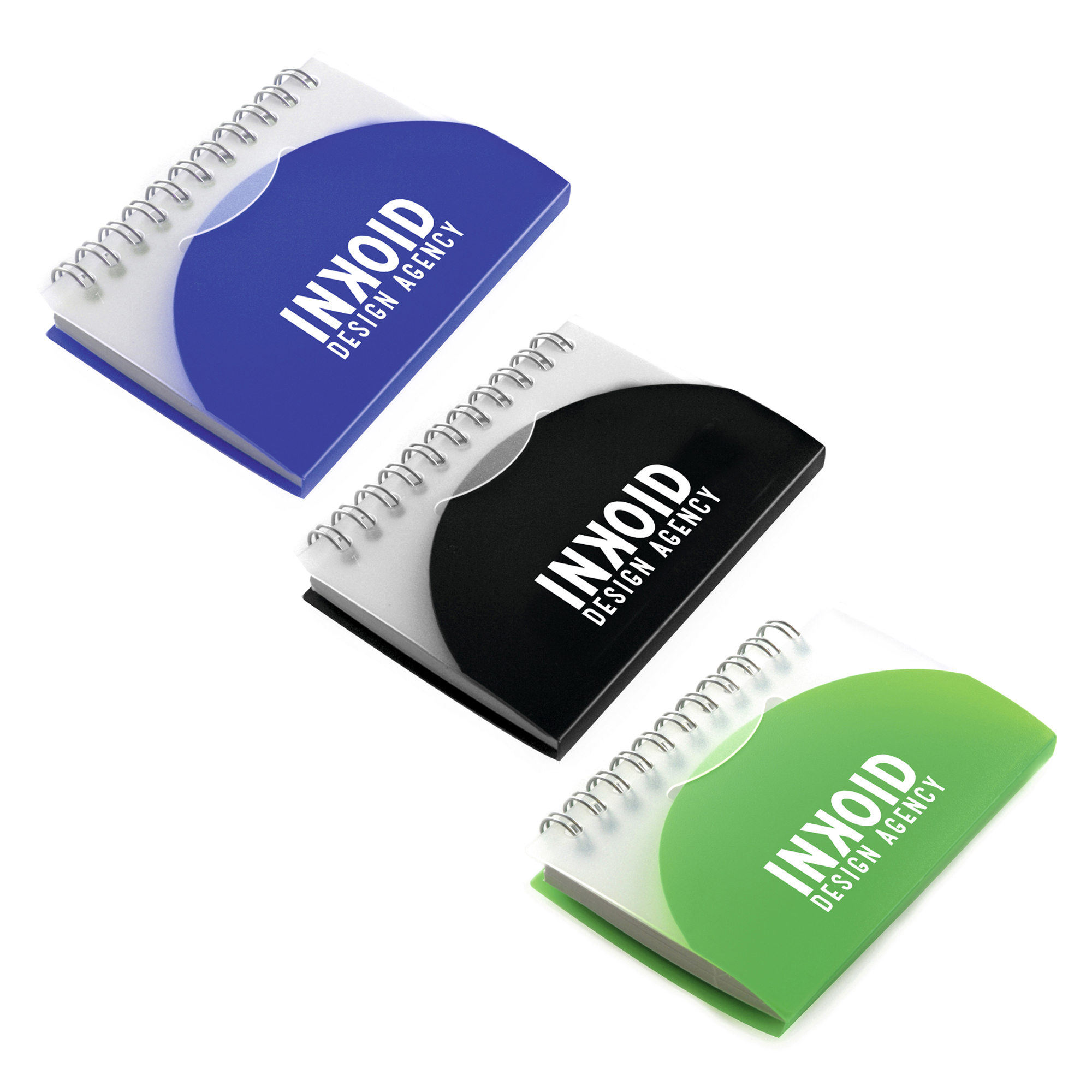 A7 spiral notebook with 80 lined sheets and a transparent envelope style tab closure