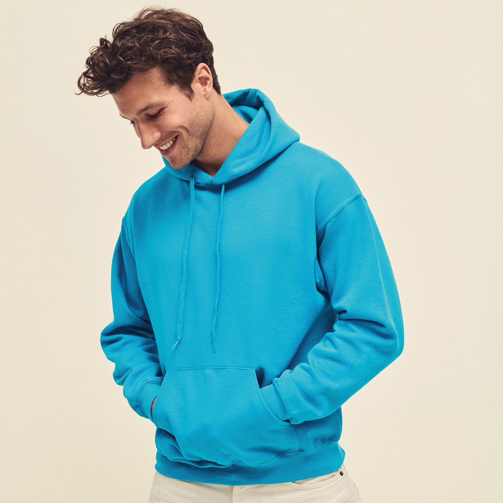 From Fruit of the Loom, this hoodie has all the attributes that you would expect from a classic brand and comes in a wide range of colour options. This makes it a go to option when considering branded workwear or personalised clothing for events in the areas of music, entertainment, promotions, licensing, tourism and so many more. Details include a front kangaroo pocket, self-coloured flat draw cord and cotton/Lycra waist and cuff ribs for added warmth. A super snug choice to show off your brand. Made with 80% cotton, 20% polyester (dark heather grey, heather green, heather royal, heather navy, heather red are 60% cotton, 40% polyester) the garment has a fabric weight of 280gsm. The makeup of the fabric makes it ideal to effortlessly embroider, screen print or use full colour DTF technique to print a company logo or message, including individual names to add that personal touch (price on application). Screen print up to 4 colours or go for the Direct to Film (DTF) technique which provides a high degree of accuracy to create an exact replica of your full colour design and captures even the finest of details in your logo. Embroidery is based on a branding area not stitch count, allowing you to make a bold statement that represents your brand without the worry of any hidden extra cost. Budget-friendly without compromising on comfort and style. Order yours today!