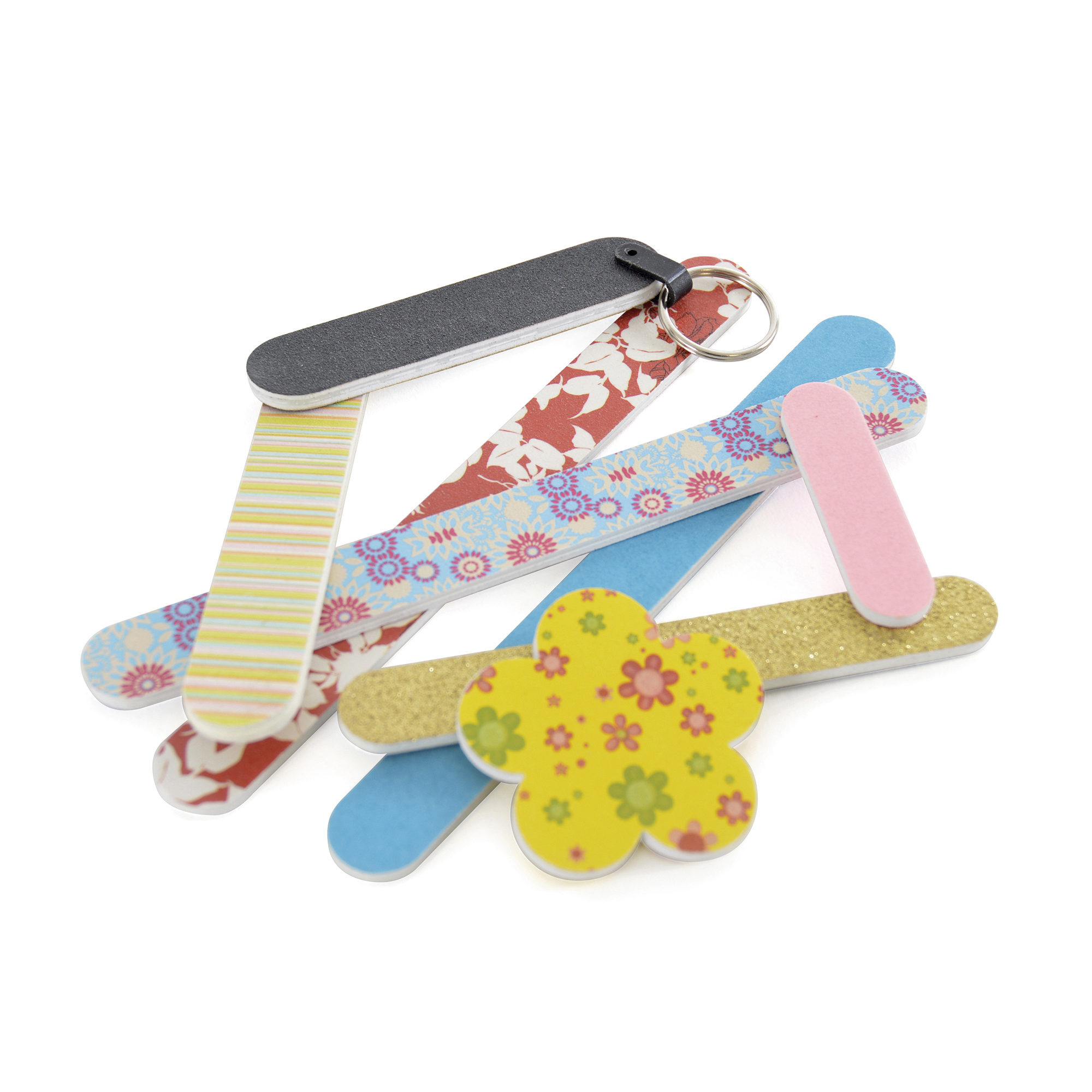 178 x 20mm double sided emery board with foam backing. Can be pantone matched at an additional cost. Other shapes and sizes are available.