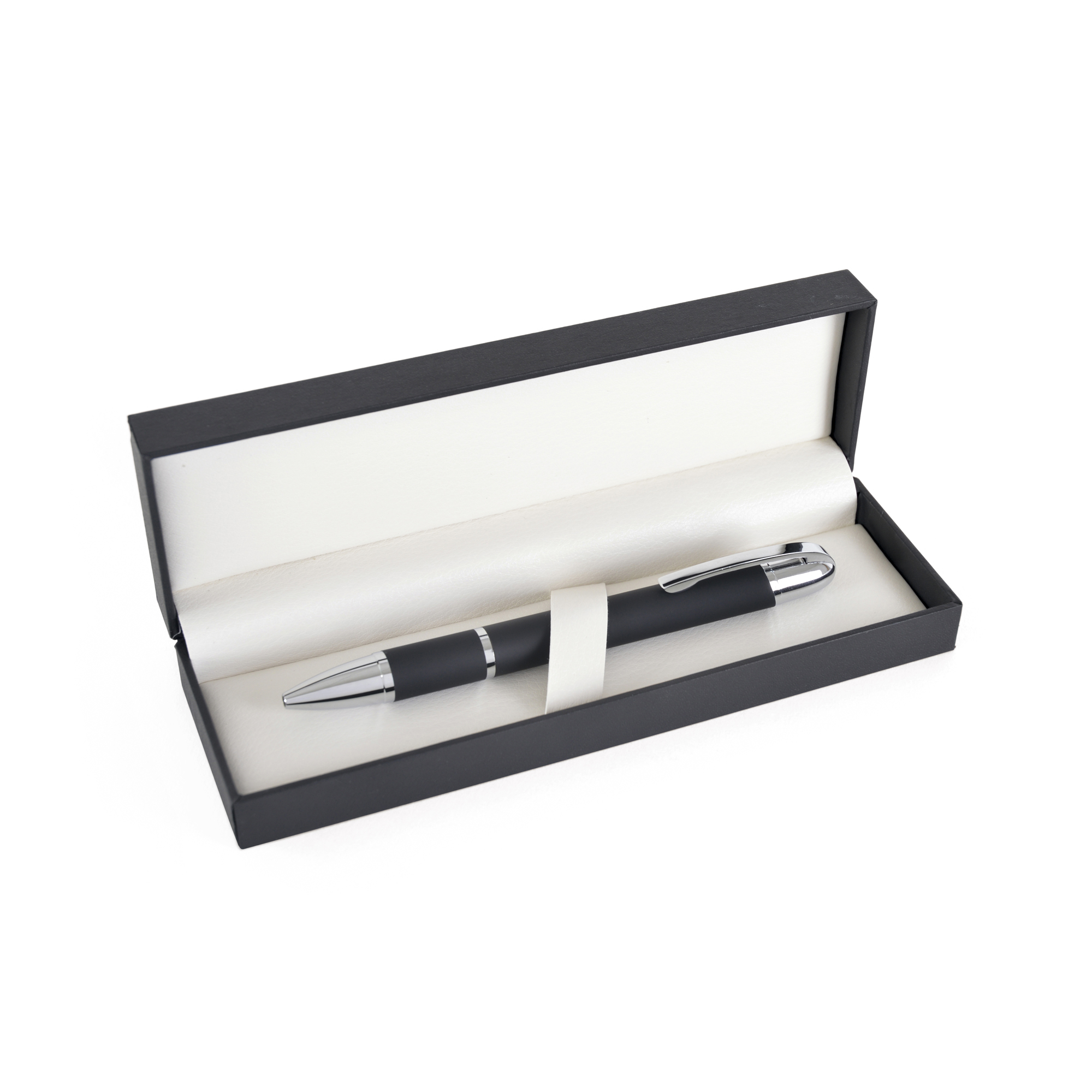 A hinged lid with cushioned interior – truly prestigious. Price is unprinted. Also available as a double pen box.