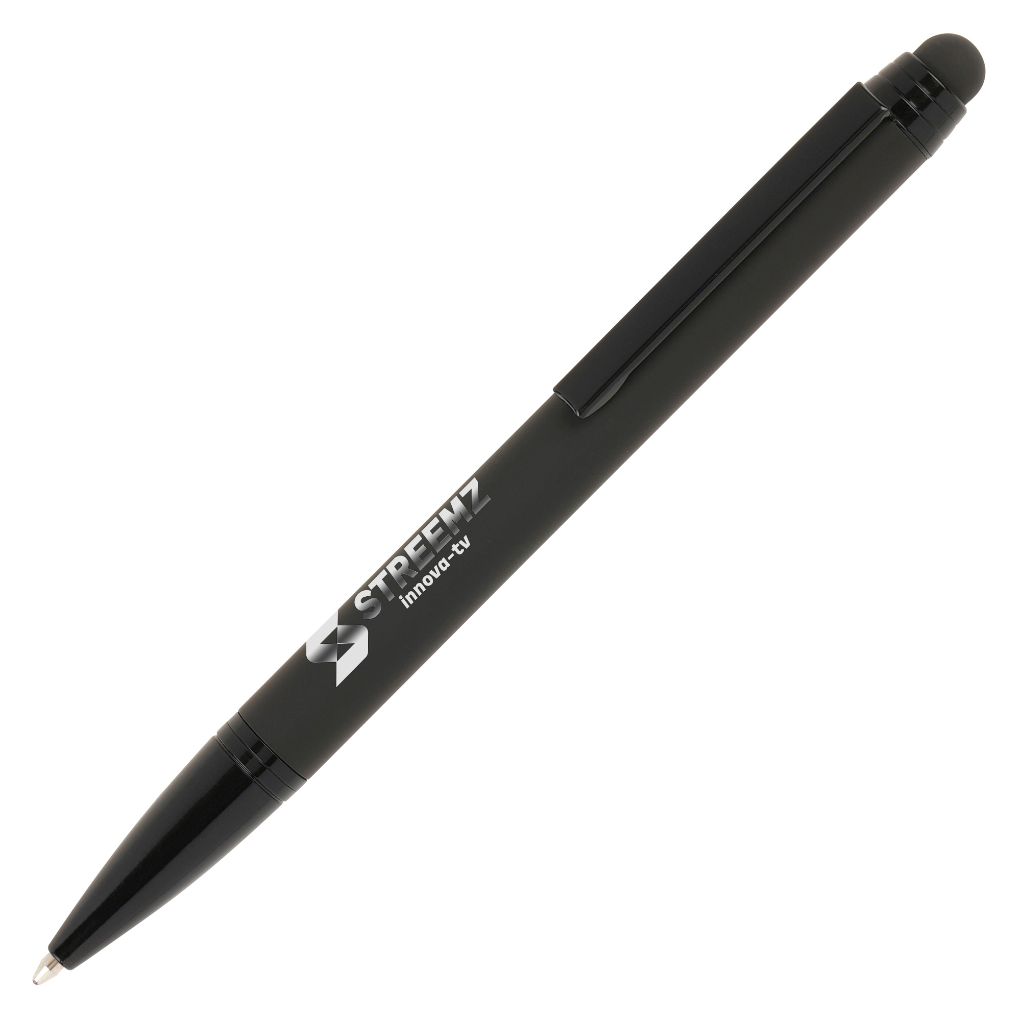 Give your brand a promotional boost with our premium Jet Black Soft Feel Stylus ball pen, a versatile writing instrument that exudes sophistication. Crafted with a sleek soft feel stainless steel barrel and equipped with a handy rubber stylus for effortless touchscreen interaction, this pen seamlessly combines style with functionality. Its quality construction, featuring brass barrel ensures both durability and a luxurious feel. This pen can be easily customised with your company logo or message, creating a truly unique promotional item that represents your brand identity. With its premium look and practical features, this pen makes for an ideal giveaway at corporate events, trade shows, or as a token of appreciation for clients and employees. Order yours today!