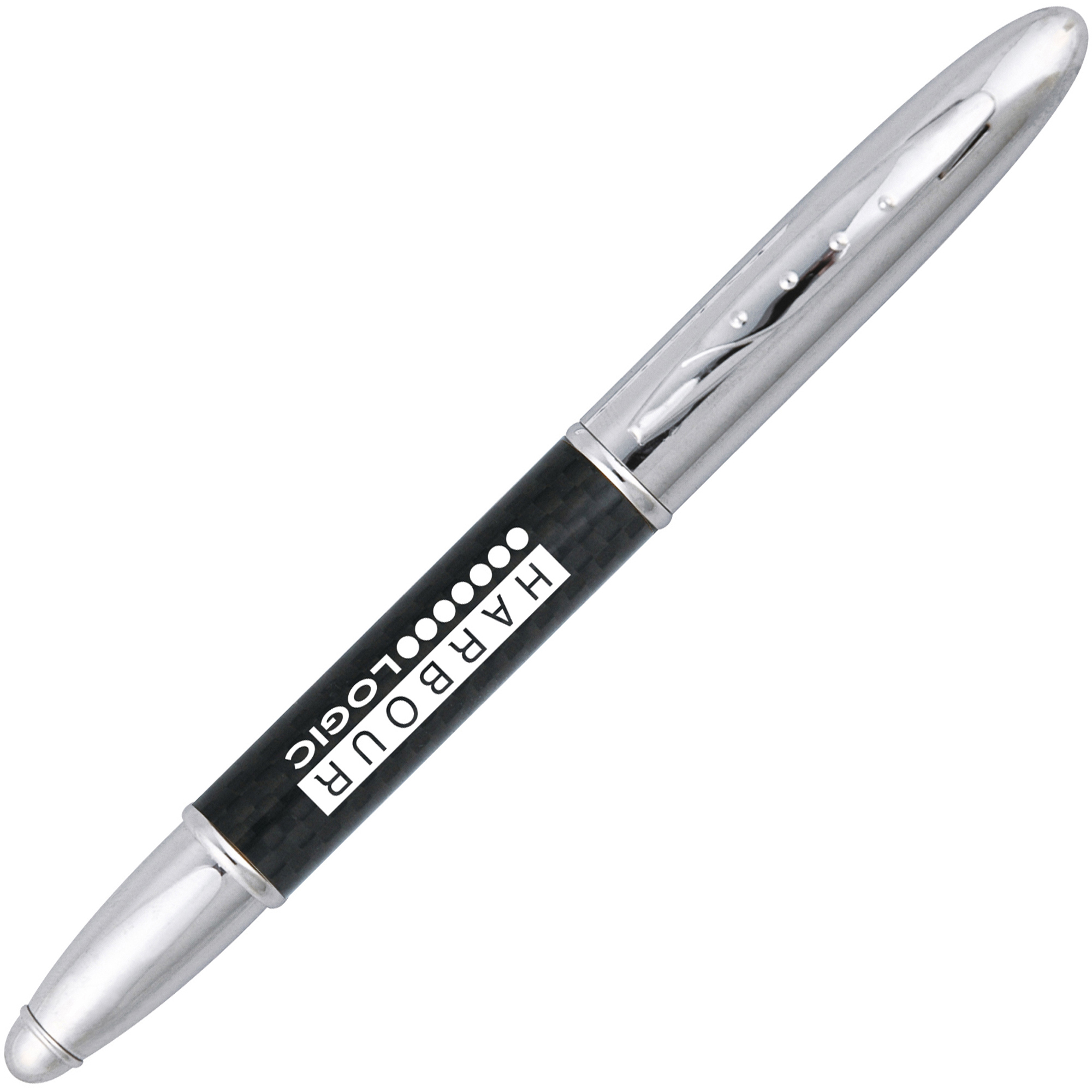 A modern-look, capped roller pen with a carbon fibre barrel. Can be supplied on its own or as a set with the matching ball pen.