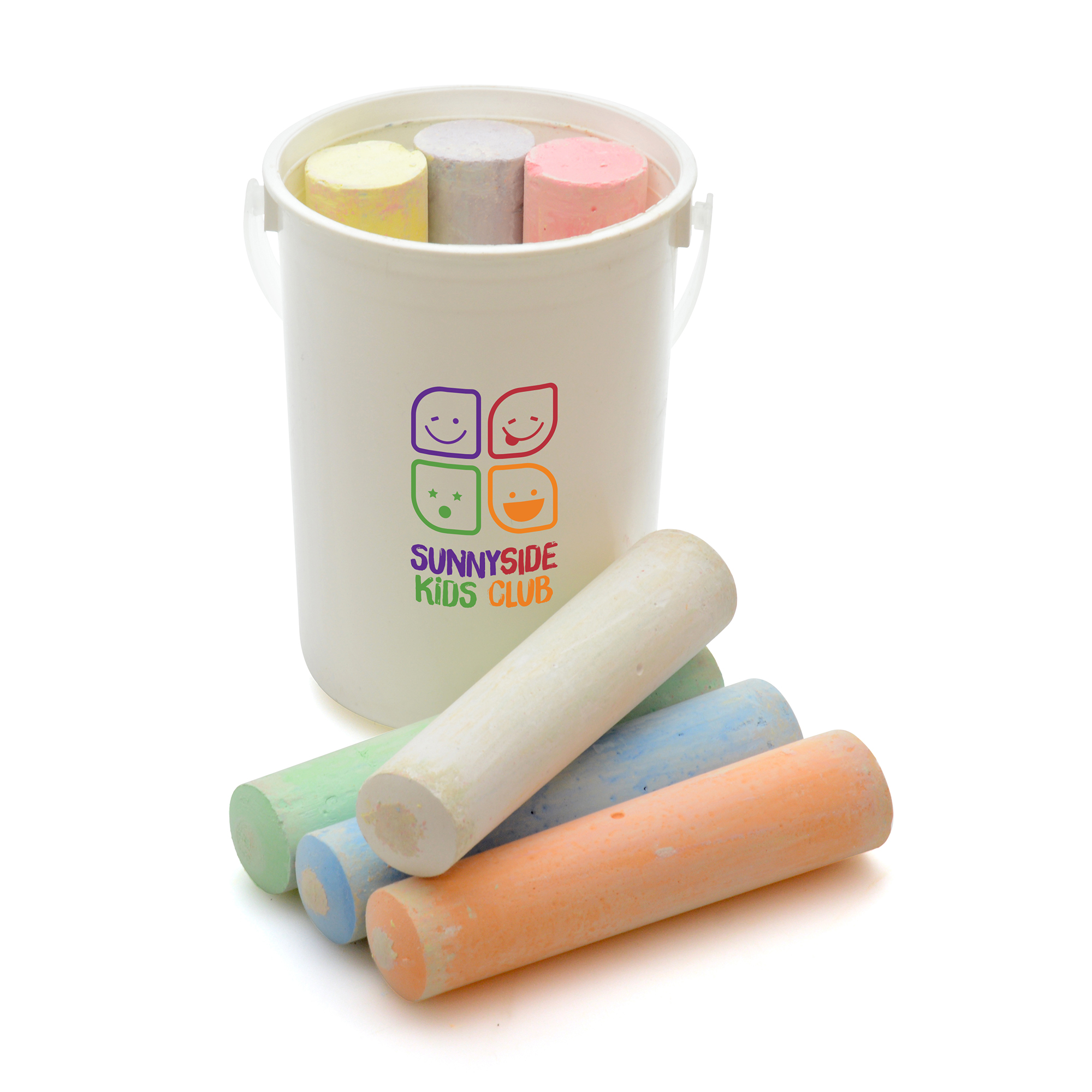 Customised 7 piece jumbo coloured chalk set housed in a white PP plastic tub with handle and clear lid. The jumbo chalks are chunky, allowing better grip for younger children and come in 7 bright and bold colours: red, orange, yellow, green, white, blue and purple. Add your company logo to the storage tub and let your brand bring the fun. The Marico Chalk Set is the ideal promotional product for schools, nurseries, clubs and family events, with everything they need to have fun being creative. Tested age grade is 3+ years. Choose the Marico Chalk Set for your next promotion – order yours today.