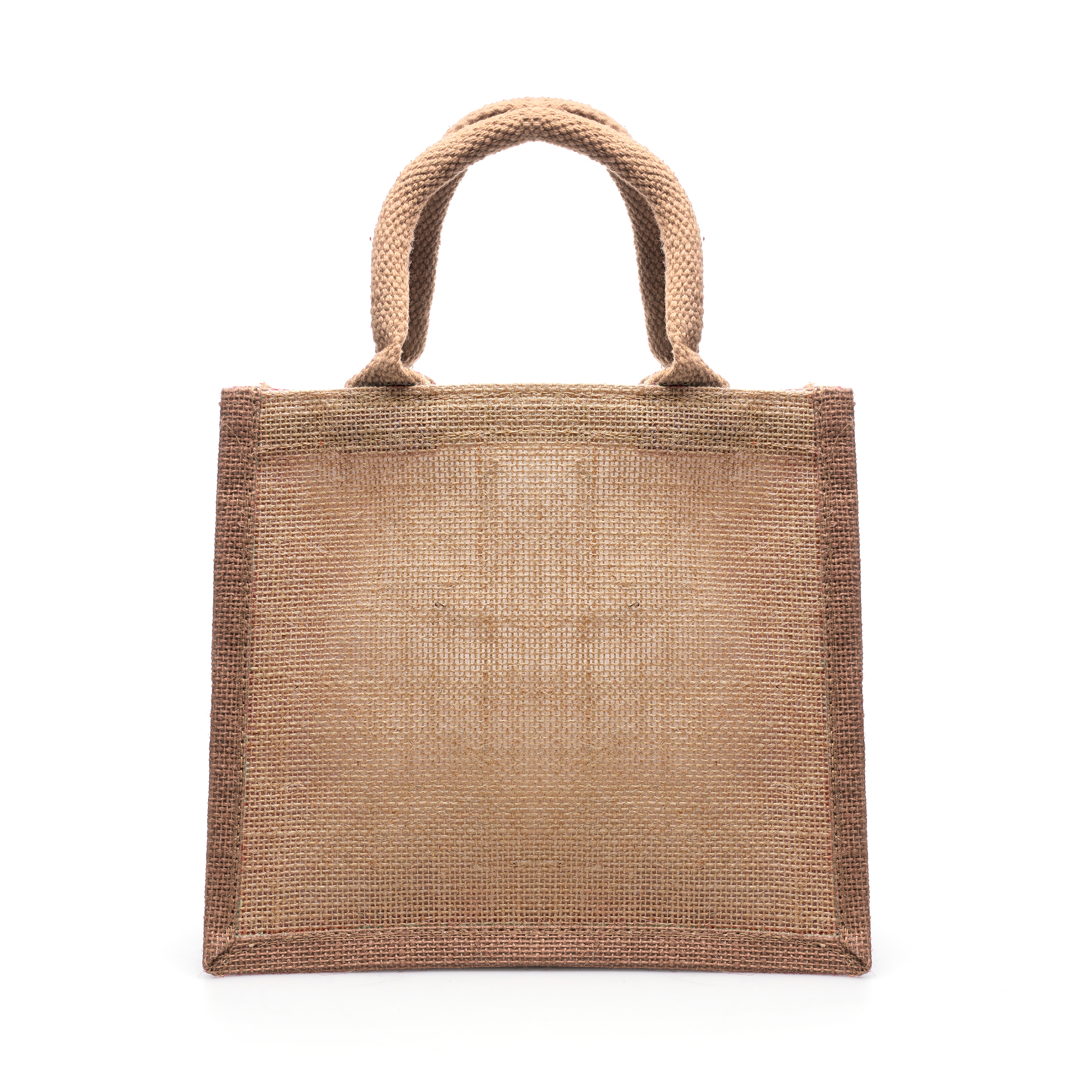 The mini natural jute bag with gusset, padded cotton webbed handles, jute trim and laminated backing.