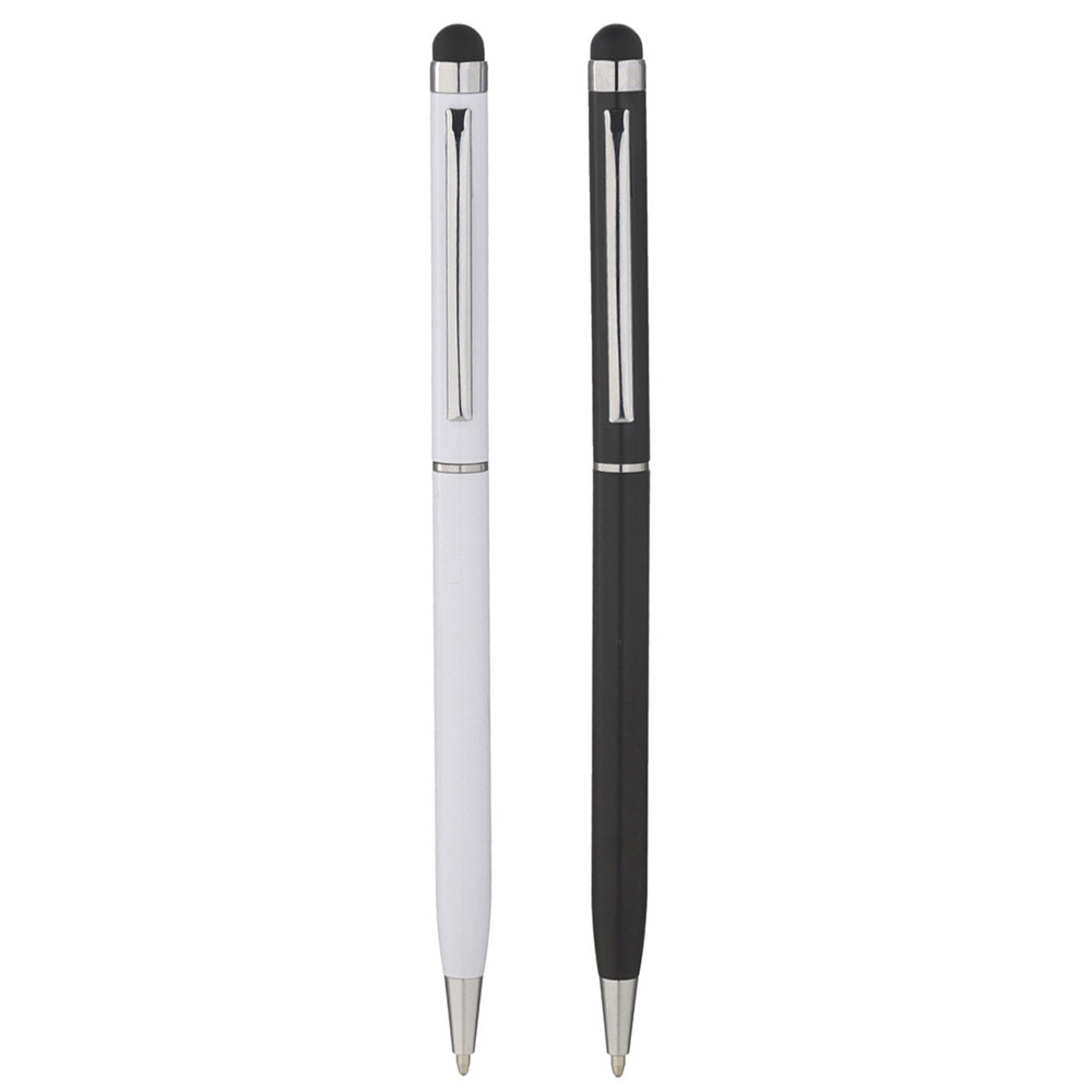 A glossy elegant, slim twist action ball pen with soft stylus at one end for use on soft touch devices.