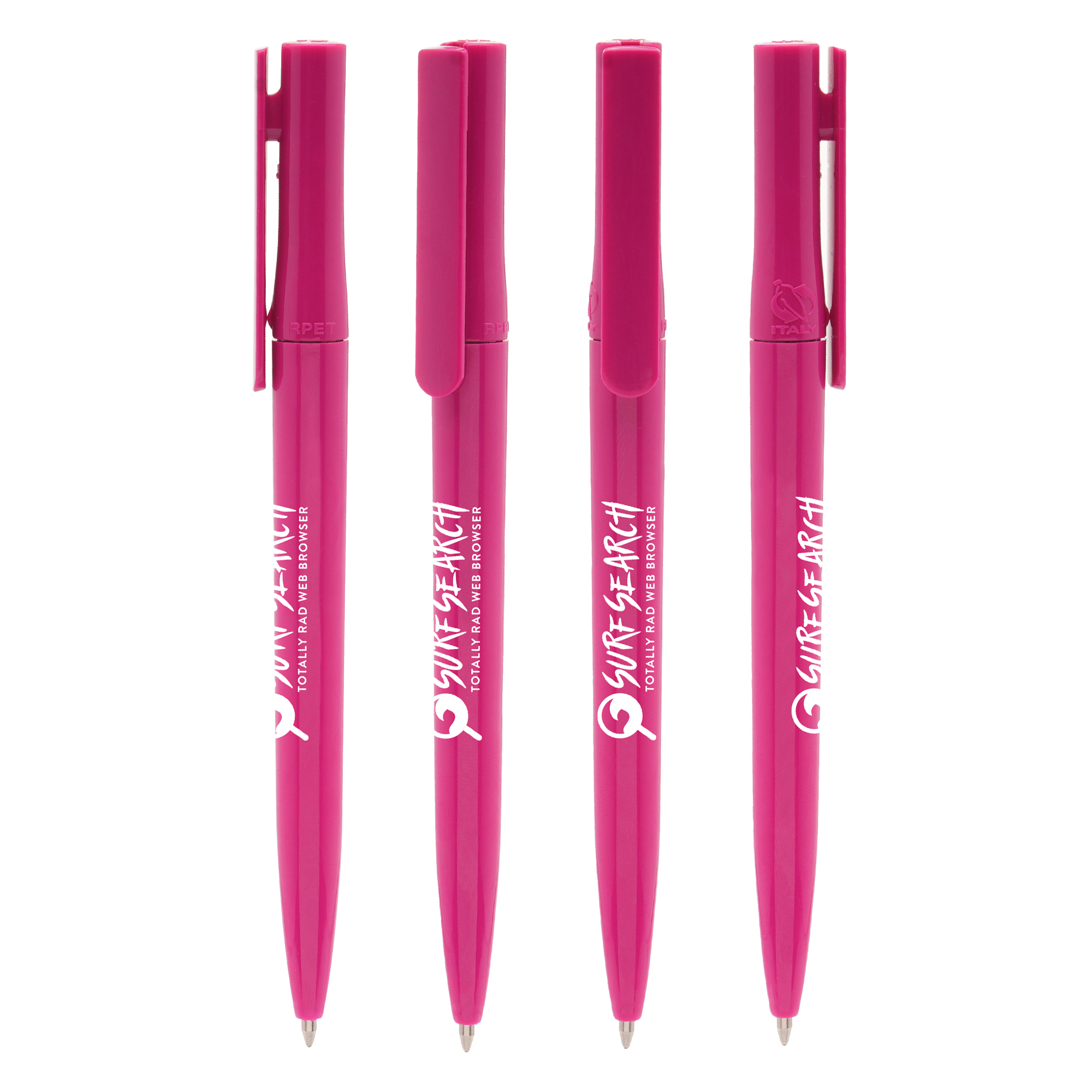 Quality twist action solid colour ball pen made in Europe from recycled PET from used water bottles.